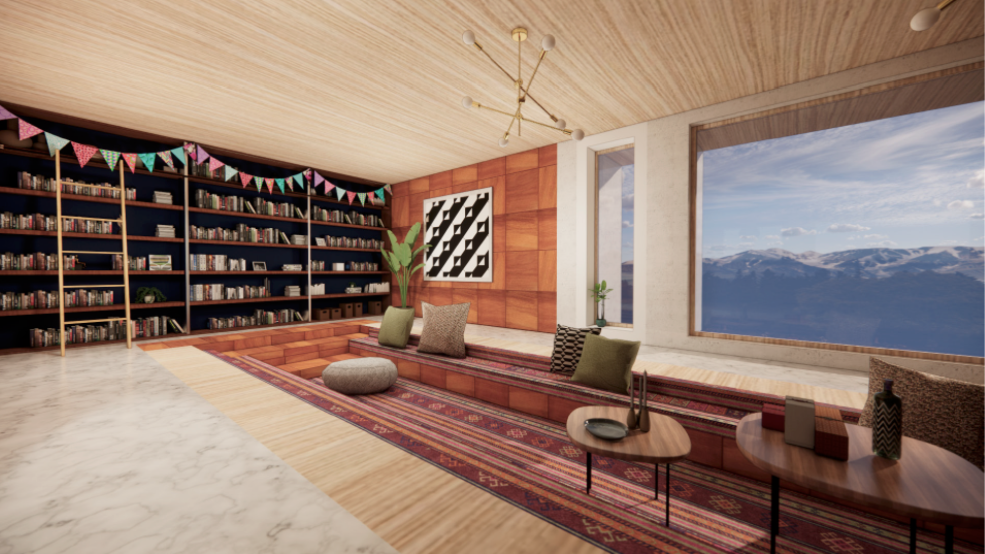A re-imagined interior based on Paul Rudolph’s iconic Milam House. This interior features a cozy retreat nestled in the mountains. With a sunken living room, and large windows inviting the outside in, this retreat offers a place of refuge and escape.
